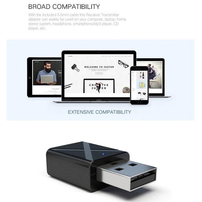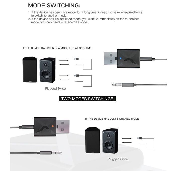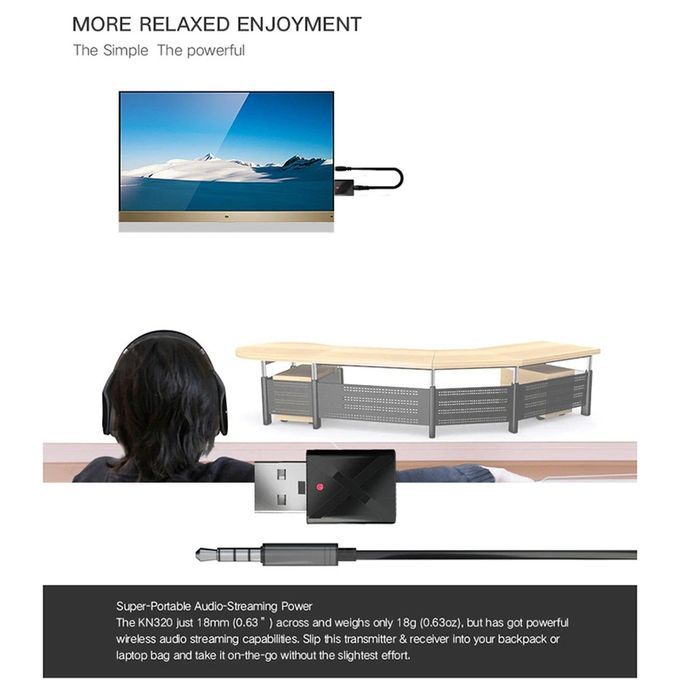 SpecificationsModel: KN320Technologies: BT5.0, A2DP, AVRCP (receiver mode only)Operation Range: Up to 10m / 33ft (without any blocking objects)Pairing name(Receiver mode ):KN320Transmitter mode: red LED light is onReceiver mode: blue LED light is onDimensions: 32mm*17mm*8.5mmPackage Content1x Bluetooth 5.0 Audio Transmitter/Receiver Adapter1x 3.5mm Aux Cable1x User Manual1. This extremely portable, lightweight wireless audio transmitter & receiver is an ideal wireless audio solution for a wide range of situations and uses2.Transmitter mode:wirelessly streams audio from your non-Bluetooth TV, home stereo system, or CD player to your Bluetooth headphones or speakers3. Receiver mode: wirelessly streams audio from your Bluetooth-enabled phone, tablet, or computer to your wired stereo, speakers, or headphones4. Mode switching:a) If the device has been in a mode for a long time, it needs to be re-energized twice to switch to another mode.b) If the device has just switched mode, you want to immediately switch to another mode, you only need to re-energize once.5. Pairing methoda) RX mode: Pairing name: KN320, find KN320 in the Bluetooth settings of the phone to pair. The blue light flashes during the pairing process, and the blue light stops flashing after the pairing is successful. Connect the product to the audio device with a 3.5 audio cable.b) TX mode: TX mode will automatically search for other Bluetooth receiving devices (such as Bluetooth headset, Bluetooth speaker, Bluetooth receiver, etc.), the red light flashes during pairing, and the red light stops flashing after pairing succeeds. Connect the product to a device such as a TV with a 3.5 audio cable/RCA audio cable.6. The KN320 just 32mm (1.26”) across and weighs only 3.2g (0.11oz), but has got powerful wireless audio streaming capabilities. Slip this transmitter & receiver into your backpack or laptop bag and take it on-the-go without the slightest effort.7. Broad Compatibility: With the included 3.5mm cable, this Receiver Transmitter adapter can widely be used on your computer, laptop, home stereo system, headphone, smartphone, Mp3 player, CD player, etc.