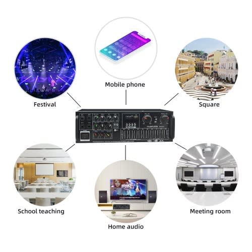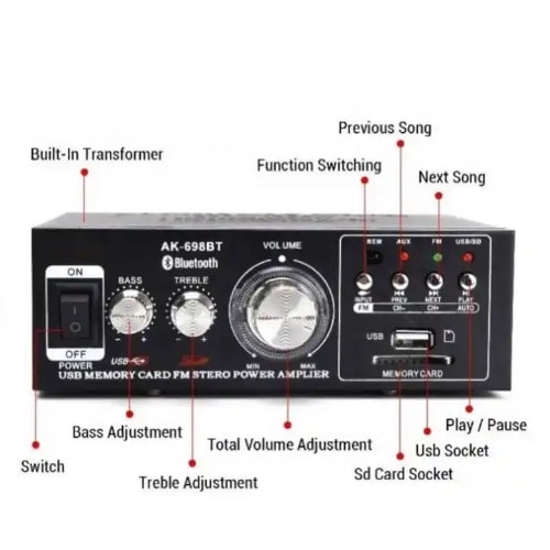 Features : With Bluetooth, remote control, USB SD Jack, FM Radio, Karaoke with reverb, can connect 7 speakers + 1 active subwoofer.