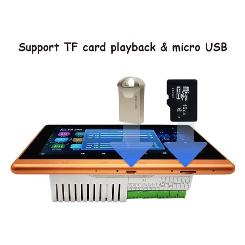 All-key Waterproof Touch Support TF card, USB Play 2 or 4 channel Speaker Output Support departure doorbell Support Trigger Alarm Power on and play welcoming words Supporting power-off memory, power-on and trigger music play Remote control operation