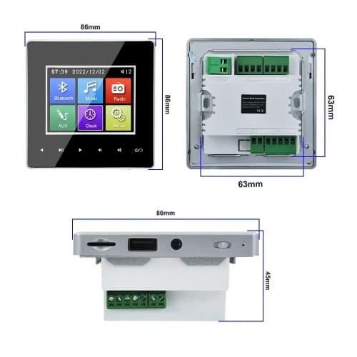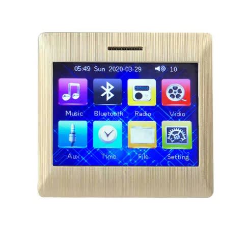 Support Bluetooth, Bluetooth Version 5.0 Surpport Video player, Radio function, Audio in, Audio out, Timing output, Timer function, Door bell, support power-off memory, power-on and trigger music play With standard cover Product size: 86*86*10mm
