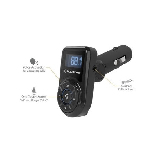 Use this Bluetooth Hands-Free Car Kit with FM Transmitter & USB Charging Port from Scosche to play music, make calls, and charge your mobile devices. It plugs into your vehicle's lighter port and has an FM transmitter A2DP Bluetooth profile so you can transmit music and other audio to your car stereo. The built-in mic and DSP echo cancellation ensure crystal clear conversations with friends and family. You can even use voice controls to answer incoming calls for a hands-free experience.