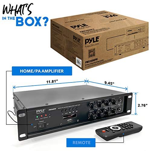 Details: Features: - Bluetooth Wireless Streaming Ability - Built-in USB Playbak - LED Display - USB Flash Drive & SD Memory Card Readers - Aux Input - MP3/MIC/AC-3 Inputs - Digital LED Display - Mirophone 1 and 2 Level Gain and Talk-over Control - Mirophone 1 Priority funtion - Mi Talk-over Ability to Speak Over Audio, Karaoke Style - Desktop Home/PA Mixing Power Amplifier - Compat Home Theater-Stereo Reeiver Style - Built-in Bluetooth for Wireless Musi Streaming - Optial/Coaxial Digital Signal Inputs - Aux Audio Input Seletion - MP3/WAV Audio Files Support - Connet & Stream Audio from External Devies - Front Panel Audio Control Center - Treble, B, Master & Mirophone Volume Adjustable Bluetooth Connetivity: - Reeives Wireless Signal for Audio Streaming - Simple & Hle-Free Pairing Setup - Integrated Antenna for Extended Wireless Range - Works with All of Todays Latest Devies - (Smartphones, Tablets, Laptops, Computers, et.) - Bluetooth Version: 5.0 - Bluetooth Network Name: Pyle Speaker - Wireless Range: 40+ Ft. Whats in the Box: - Desktop Stereo Amplifier - Remote Control - FM Antenna Tehnial Spes: - Power Output: 0 Watts Peak Power - Remote Control : Need 2x AAA (not inluded) - MAX Power Output: Watt x2( 4 Ohm) - RMS Power Output: 35 Watt x 2 ( 4 Ohm) - Tone Control: B, f=Hz +/-12dB, Treble, f=10 KHz +/-12dB - Tone Control for Mi: B, f=Hz +/-8dB, Treble, f=10 KHz +/-8dB - Frequeny Adjustment: +/-2dB - Signal to Noise Ratio: >71dB - T.H.D.: 45dB - Radio Station Presets: Up to 40 Stations - Power Supply: V/240V, Swithable - Dimensions (L x W x H): 11.81 x 9.45 x 2.76 -inhes.