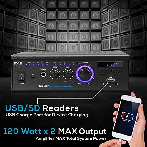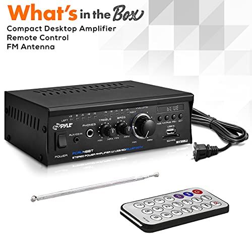 Details: Features: - Hi-Powered Audio Amplifier System - Mini Blue Compat Home Desktop Amp Style - Built-in Bluetooth for Wireless Audio Streaming - Works with All Your Favorite Bluetooth Devies - (Works with Smartphones, Tablets, Laptops, Computers, et.) - Connet & Stream Audio from External Devies - SD Memory Card & USB Flash Drive Readers - Digital LCD Display Panel with Touh Button Controls - USB Charge Port for Devie Charging - Front Panel Button Control Center - RCA Audio Input (L/R) - AUX (3.5mm) Input Connetor Jak - Treble, B, Master Volume Adjustable - Push-Type Speaker Terminal Connetors - 1/4 Headphone Jak - Rotary Master Volume Control Knob - Built-in Short Ciruit and Power Surge Protetion - LED Indiator Lights with Audio Output Level Display Bluetooth Connetivity: - Simple & Hle-Free Pairing - Instant Wireless Audio Streaming Ability - Works with All of Todays Latest Bluetooth Devies - (iPhone, Android, Smartphone, iPad, Tablet, PC, et.) - Bluetooth Network Name: PYLEUSA - Bluetooth Version: 4.0 - Wireless Range: Up to 30+ ft. Whats In The Box: - Compat Desktop Amplifier - Remote Control - FM Antenna Tehnial Spes: - Power Output: Watt x 2 MAX - 10% RMS at 4-Ohm Impedane - Signal-to-Noise Ratio: 75dB - Frequeny Response: 20Hz - 20kHz - Input Sensitivity: 1mV - T.H.D.: 0.3% - B/Treble: +/-10dB - V/240 Voltage Seletor, /Hz - Dimension (W x H x D): 8.27 x 2.83 x 5.43 -inhes