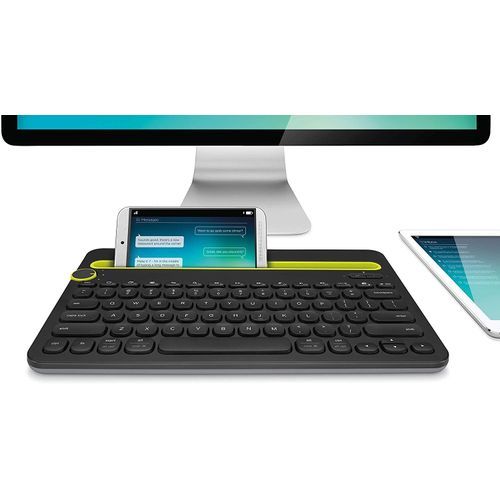 The Bluetooth Multi-Device Keyboard K480 is a unique keyboard for your computer. That also works with your tablet and smartphone. The Easy-Switch dial lets you switch typing between 3 connected Bluetooth wireless devices, and you'll find a familiar keyboard layout with shortcut keys for Windows, Mac or Chrome computers, as well as Android and iOS mobile devices. Multi-platform and cross-platform. The integrated cradle holds your phone or tablet at just the right angle for you to read while you type. Most phones and tablets up to 10.5 mm 0.4 inches thick and 258 mm 10 inches wide. System Requirements: PC: Windows 7 Windows 8 Windows 10-Mac: Mac OS X or later-Chrome OS-iPad or iPhone: iOS 5 or later-Android tablet or smartphone: Android 3.2 or later.-Internet connection (for optional software download) K480 Bluetooth Multi-Device Keyboard