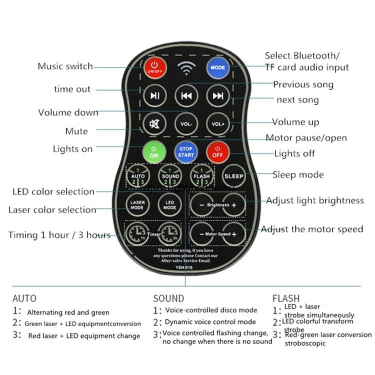 3. The remote control can adjust the watermark color, watermark speed, watermark mode, Bluetooth mode, watermark single control, laser single control, brightness, music control, sound control, selection mode, timing function, switch, any mobile phone or other The device can be connected by turning on Bluetooth without checking