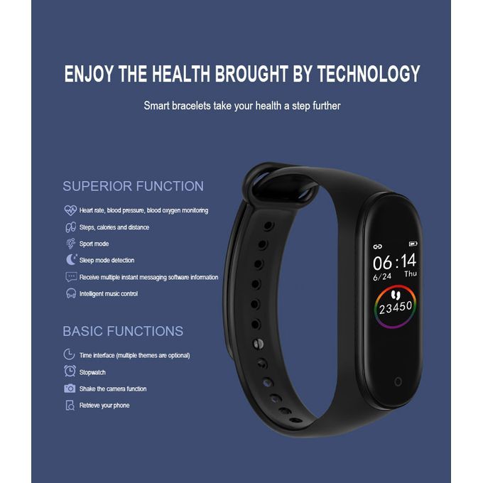 Are you looking for waterproof smartwatch or sport fitness tracker? Welcome here for smart wearableproducts which you like, any more details, please check below information.Here are the features of M4 Smart Bracelet:1. 【High-definition large-screen sports bracelet】: Adopt 1.3inch HD full view TFT color screen, carefully de-signed from inside out, between the square inch, take on a new look and it.can display text messages, call prompts and other APP information push.2. 【Sports and Pedometer】: Get data on the number of steps, distance of movement, calorie consumption, etc., and encourage and supervise your own exercise;3. 【Blood pressure monitoring】: Blood pressure can be measured anytime and anywhere, blood pressure can be measured without a mobile phone, and blood pressure data on your wrist can be obtained at your fingertips.4. 【Heart rate monitoring】: Monitor your heart rate 24 hours a day, and monitor your health at all times;5. 【Instant Information Push】: whether it's a call alert or a message from a social platform, it will be presented one by one on the bracelet, so that you don't miss any message. 6. 【Sleep monitoring】: automatic detection of sleep at night, scientific and comprehensive analysis of sleep quality, you can understand your sleep and improve your sleep quality better through these data.7. 【Sports mode】: Reasonable amount of exercise helps us to be healthy and multi-sports mode for you to choose.8. 【Durable Life】: built in high capacity polymer lithium-ion battery, shorter charging time, longer battery life, charge through clip to make life simple.9. 【Remote Camera】: One-click remote control taking photos to keep a good moment and record every moment.