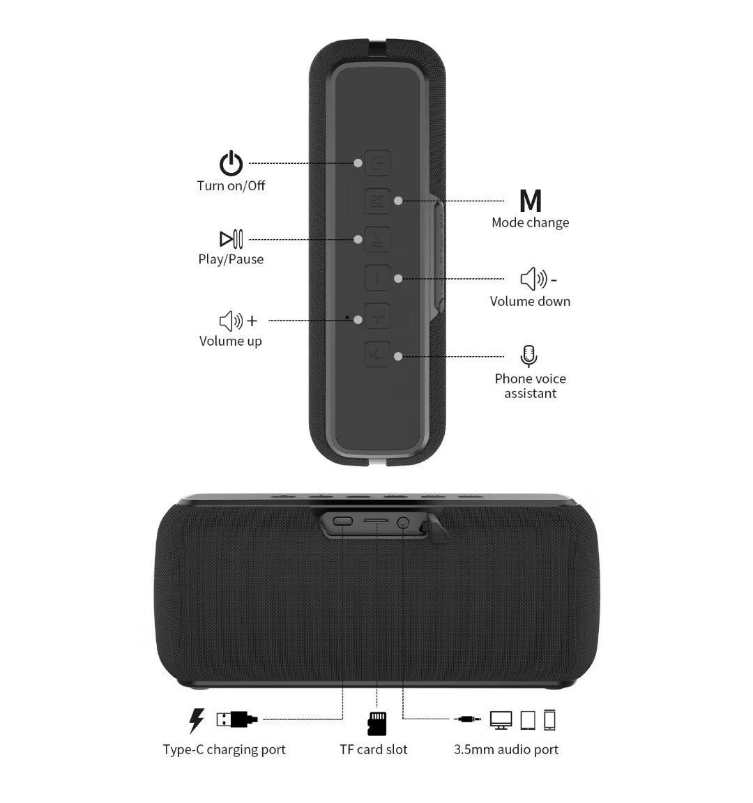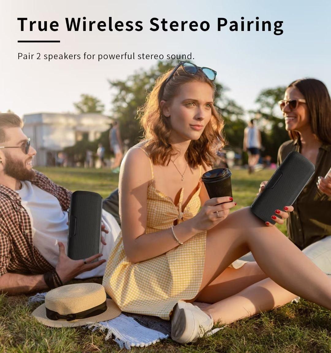 The high fidelity speaker can provide full spectrum audio with incredible 90 dB bass effect and clarity. At any hearing level, you will not find it in other portable speakers. Equipped with a 360 ° extended DSP chip and noise reduction technology, balancing high and low tones. Equipped with a built-in microphone for mobile hands-free calls. Perfect for watching movies, parties, traveling, and beaches at home.