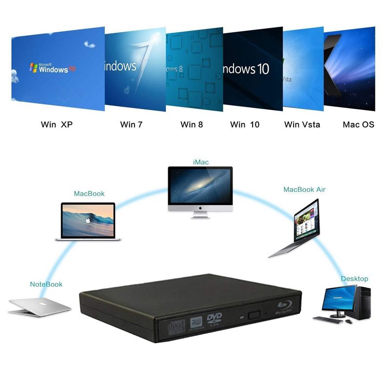 1X Bluray Player External USB 2.0 DVD Drive Blu-ray 3D 25G 50G BD-R BD-ROM CD/DVD RW Burner Writer Recorder For Laptop Computer PC
