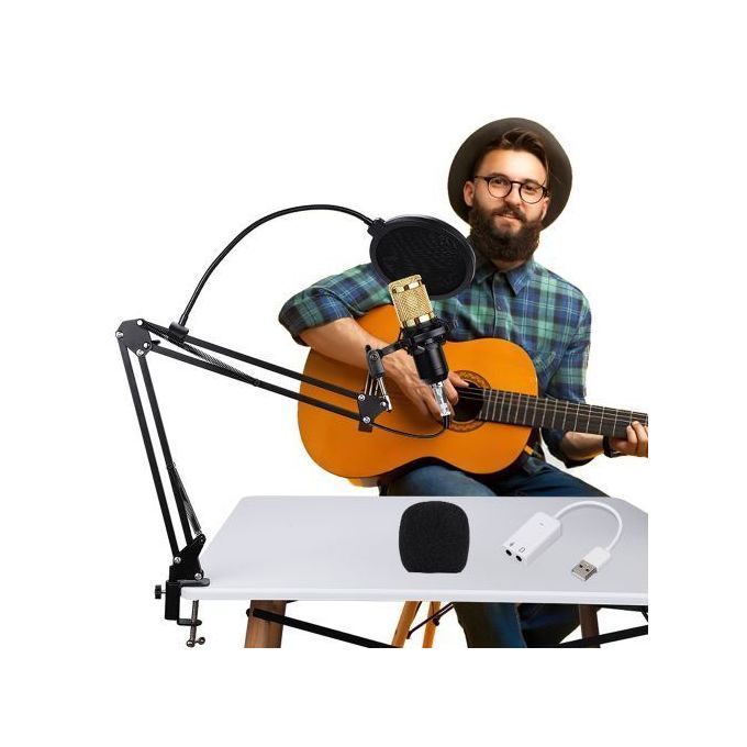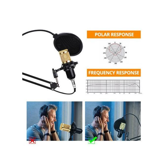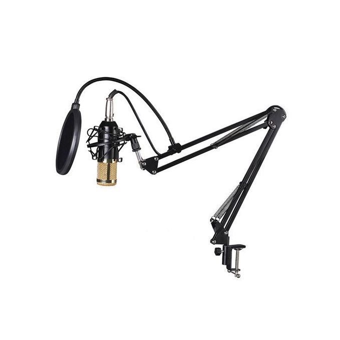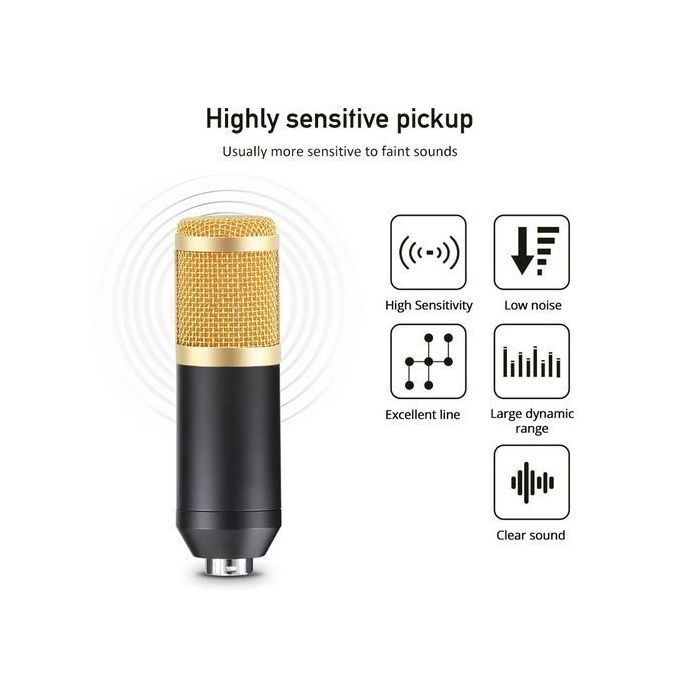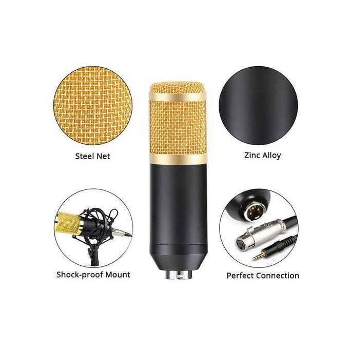 1.BM-800 microphone d'enregistrement professionnel microphone a condensateur a petit diaphragme2.Pour Ordinateur Professionnel Condensateur Audio 3.5mm Filaire BM 800 Studio Microphone D'enregistrement Vocal KTV Karaoke + Support De Microphone/студия микрофон3.Ideal pour les studios de radiodiffusion, les studios de voix off, les scenes, les stations de television, etc. Support de microphone de bureau a bras en ciseaux et filtre anti-choc4. Support de microphone de bureau stable, durable et abordable; Les bras a double renfort ajoutent de la force pour supporter beaucoup plus de poids; Bras pliables - minimisez la taille de transport et facile a ranger ; Bras de ciseaux - completement flexible ajustez l'angle et la hauteur souhaites5. Pince reglable a monter facilement sur le bureau, se fixe solidement a n'importe quel support de micro pour une installation facile et une utilisation pratique. Deux ressorts de suspension sur chaque bras de fleche pour plus de stabilite.6. Double port audio - Connectez l'entree microphone et la sortie ecouteurs/haut-parleur en meme temps.