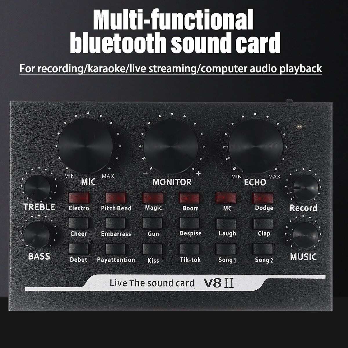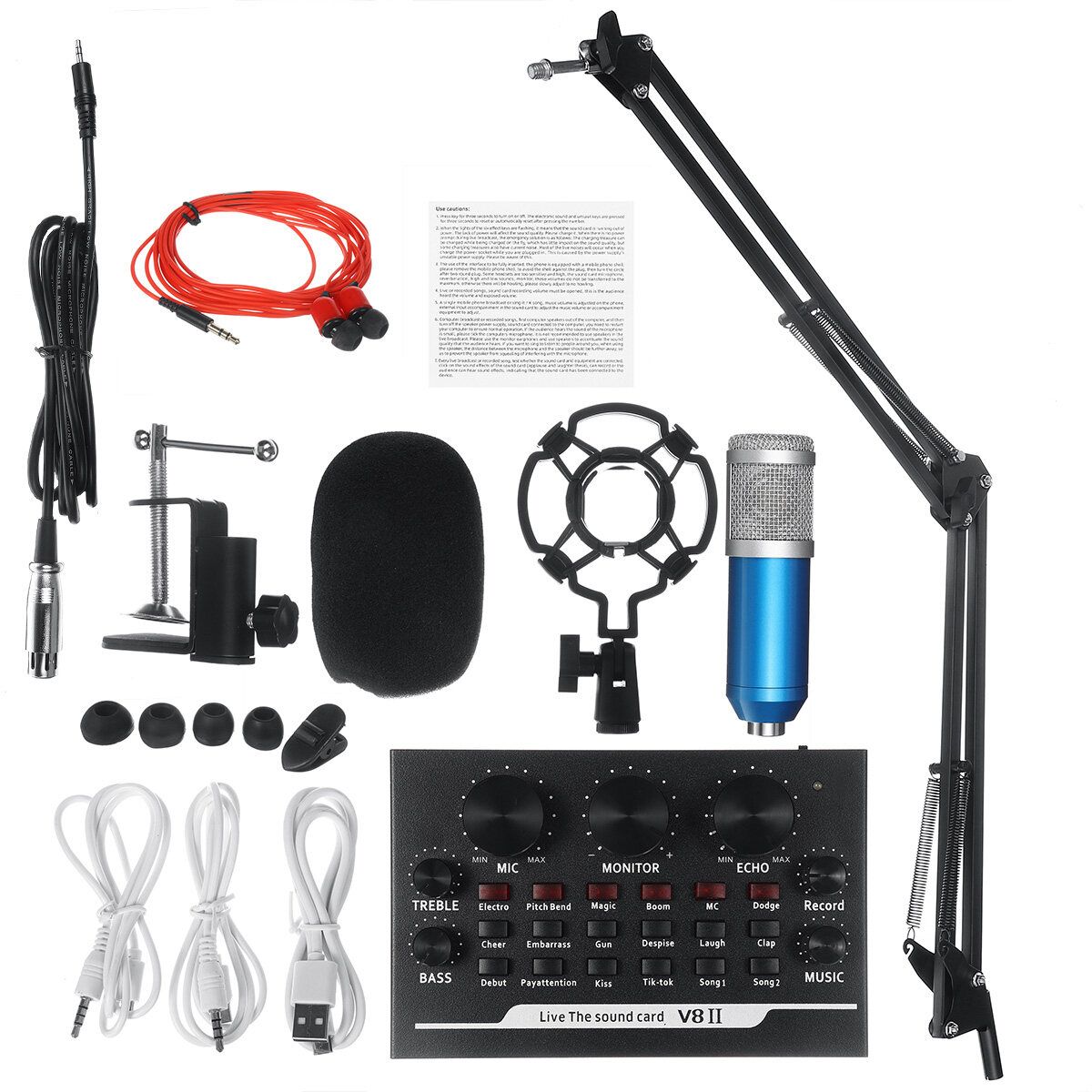 1 X Live Sound Card 1 X BM-800 condenser microphone 1 X Adjustable Microphone stand 1 X Faux-plastic shock mount 1 X Microphone windscreen 1 X XLR female to 3.5mm microphone cable 2 X 3.5mm microphone cable 1 X USB Cable 1 x Headset 2 Pairs of earplugs 1 x Clip 1 X English manual instruction