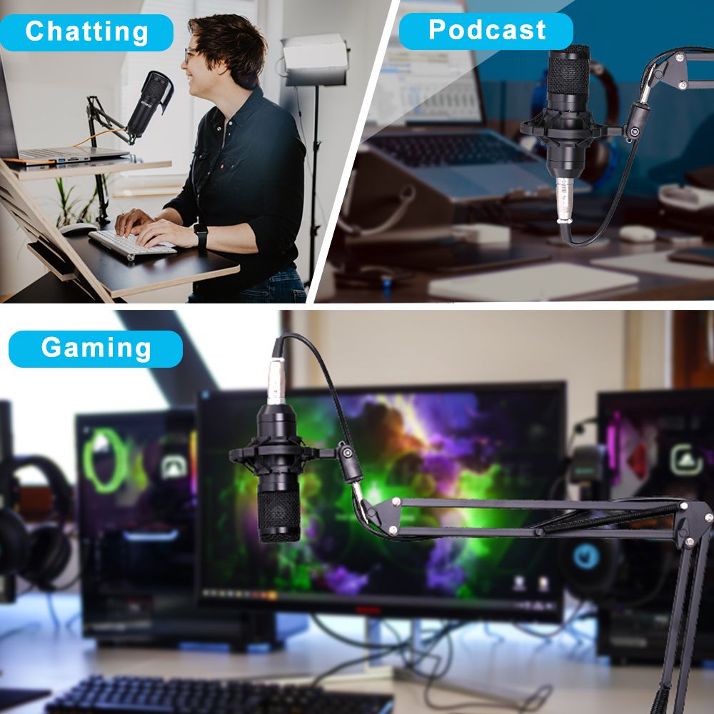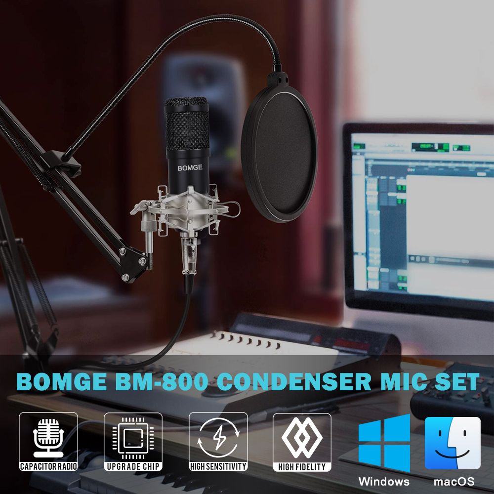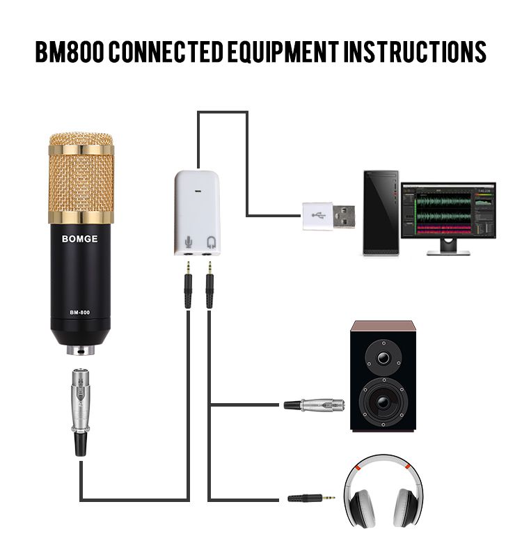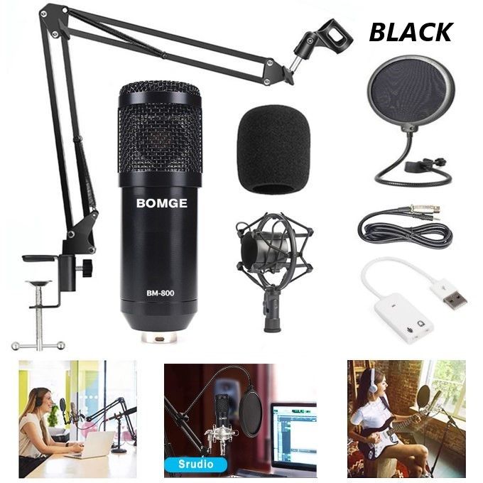 1 x BM-800 Microphone,1 x Microphone Cord,1 x Microphone Cover,1 x Mic Stand,1 x Shock Mount,1 x Acoustic Filter,1 x White USB Sound Adapter,1 x English Manual