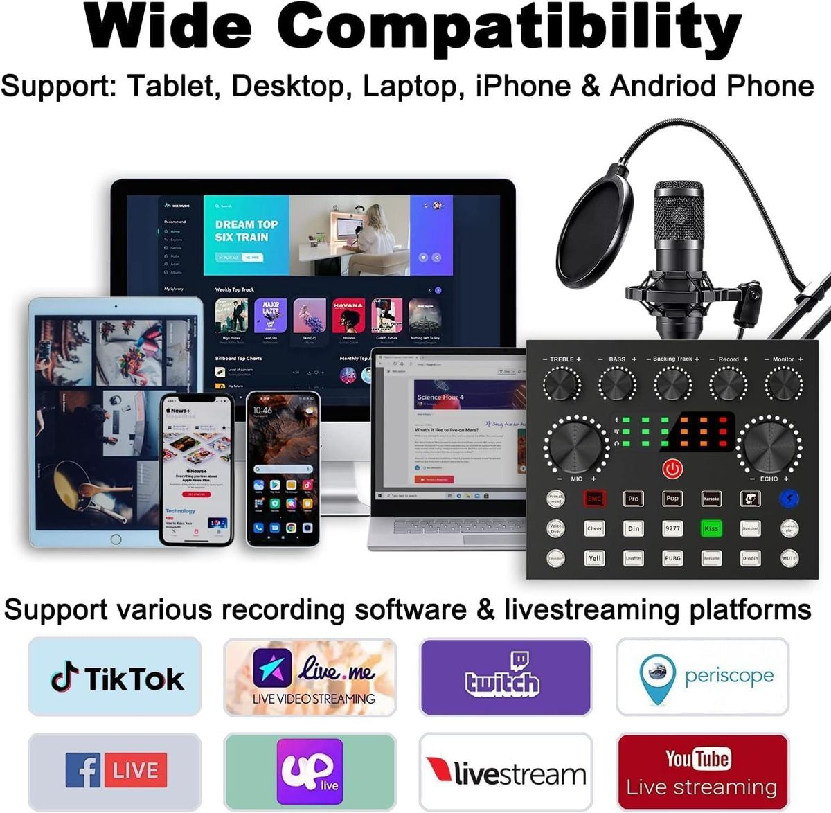 【Easy to Use】This podcast equipment bundle is very simple to use, you don't have to worry about complicated operations anymore. You can connect to different devices (mobile phone/computer/ laptop) by using different connection methods. Change your voice anytime, anywhere, call with friends, chat on for Various social APP, live and sing, take video on TikTok, Youtube, etc. The podcast equipment bundle will bring more fun to you and make your recording more creative.