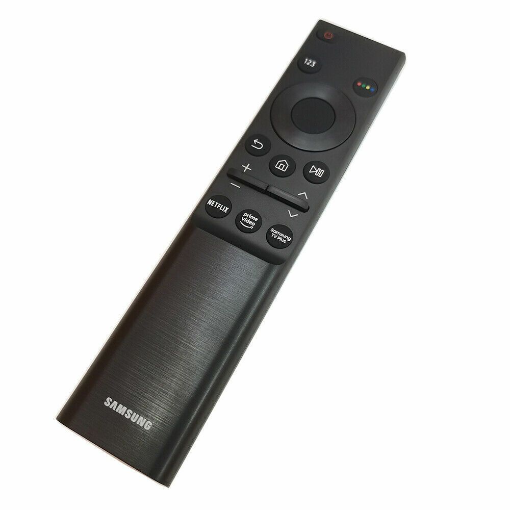 buttons for popular streaming services like Netflix and Prime Video, as well as Samsung TV Plus. The black remote is wireless and