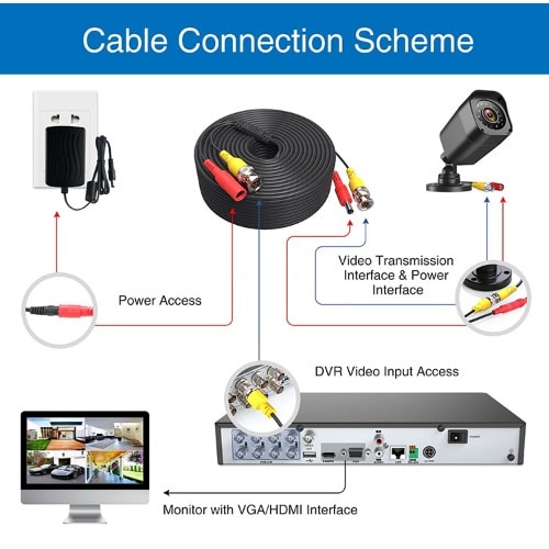 Video & Power 2-in-1 CableAll-in-one video and power cable - plug and play readyBNC connector on both ends + included BNC-to-RCA adaptersLow interference and low noise for good qualityFor video cameras with 2.1mm DC power connectors only - perfect for use with different brand video cameras (available separately)Easy to install, plug and playAll in one video and power cableFor both indoor and outdoor useSheathing material: PVCColor: WhiteInner conductor Insulation: PEExtend the cable on your camera easily with this extension kit