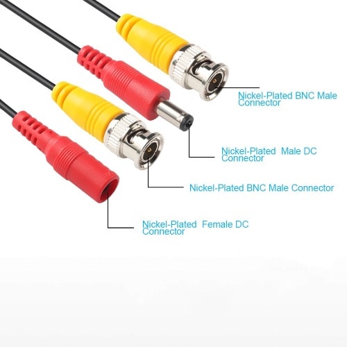 DC Power Male Size: 5.5 * 2.1 * 18.0mm / 0.22 * 0.08 * 0.7inDC Power Male : Nickel Plating & RubberDC Power Female Size: 5.5 * 2.1 * 21.5mm / 0.22 * 0.08 * 0.85inDC Power Female Material: Nickel PlatingBNC Material: Kirsite & Nickel PlatingCable Length: 50M