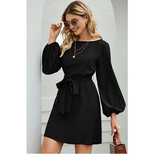 Buy Boat Neck Bishop Sleeve Belted Dress - Black in Nigeria