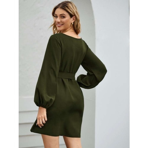 Buy Boat Neck & Bishop Sleeve Belted Dress-green in Nigeria