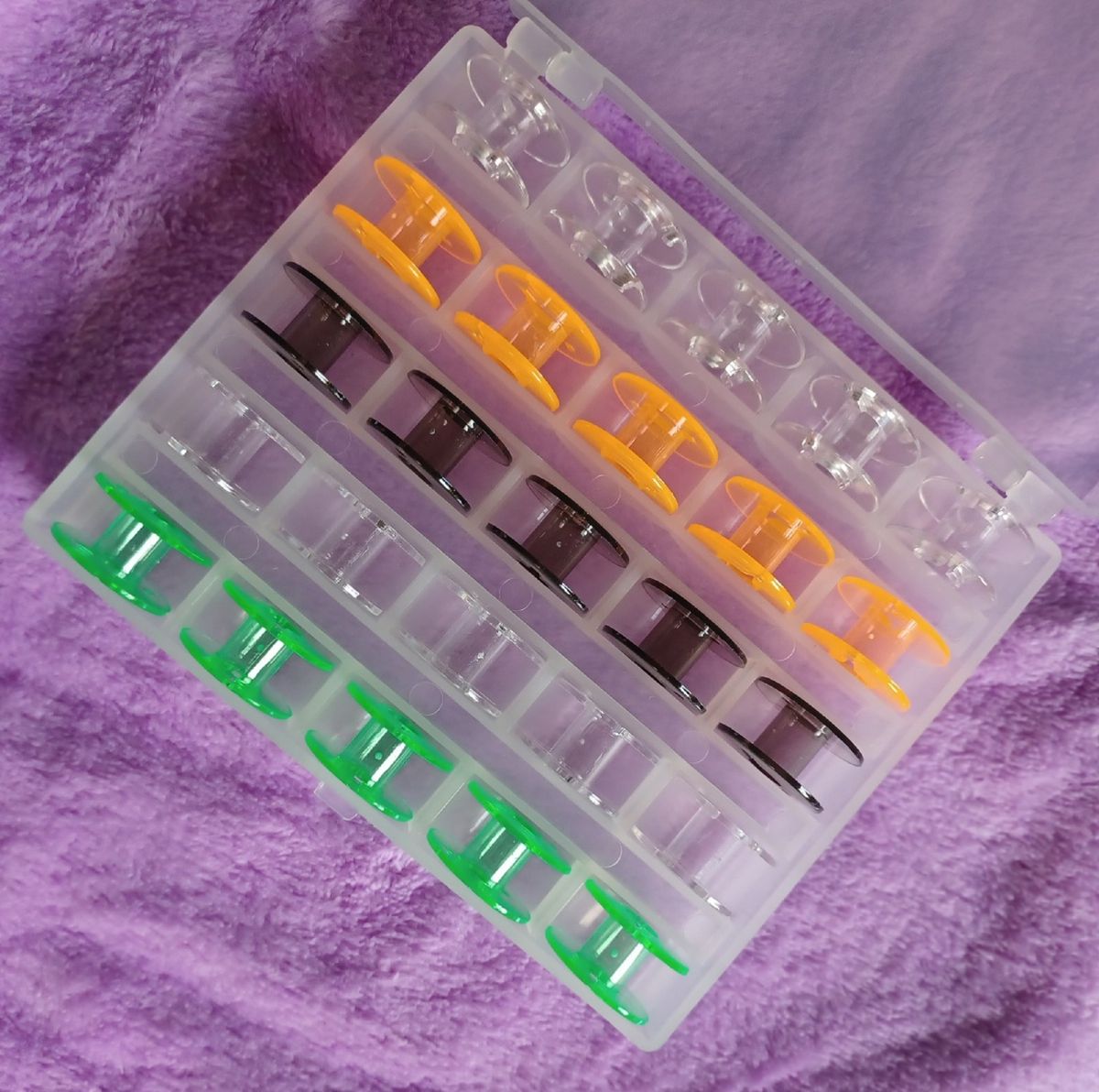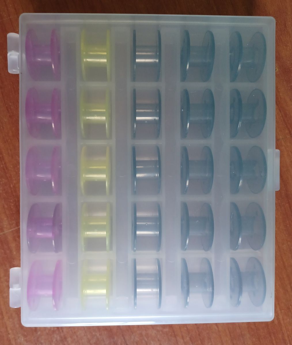 - The Plastic bobbin box comes with 25 bobbin compartment and 25 plastic bobbins of five colors.