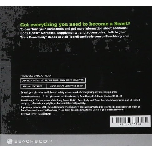 Includes four DVDs with 12 workouts, "Book of the Beast" workout and nutrition/supplement guide, and two-sided training schedule