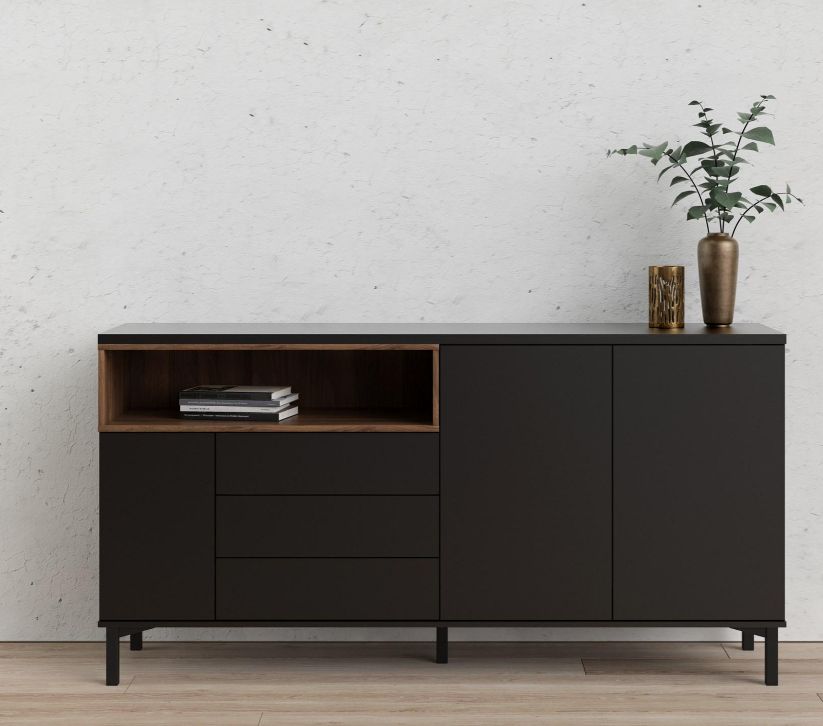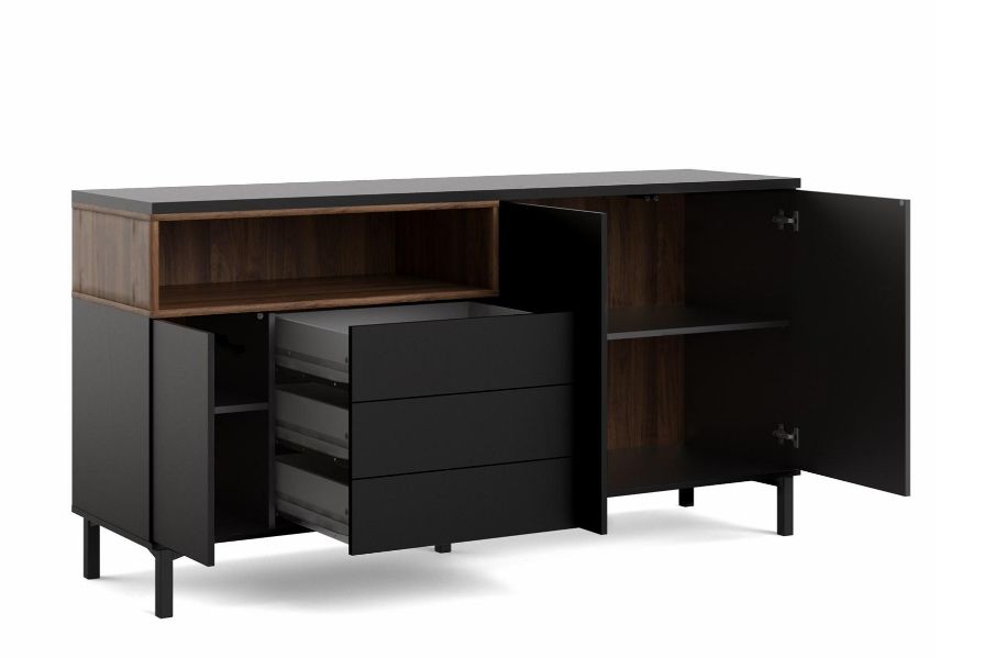 Put clutter in its place - this mid-century modern Sideboard. This stylish storage solution features ultra-clean lines, simple handle-free doors and drawers, and minimalist legs. Other smart features of this product are that it includes a contrasting open shelf for displaying books or collectible.