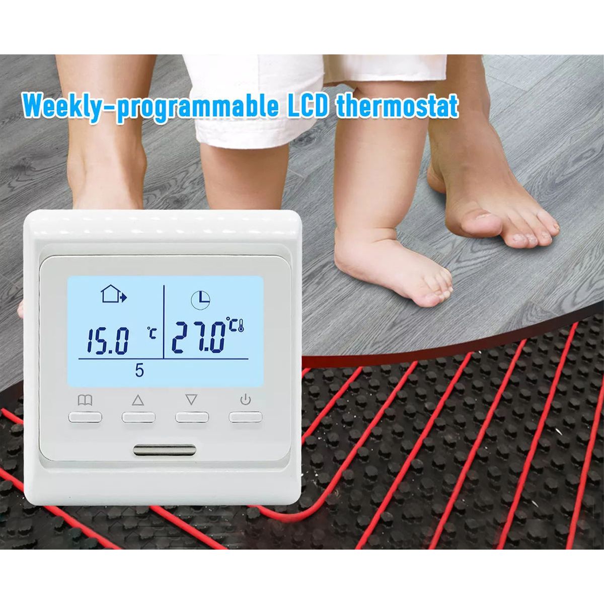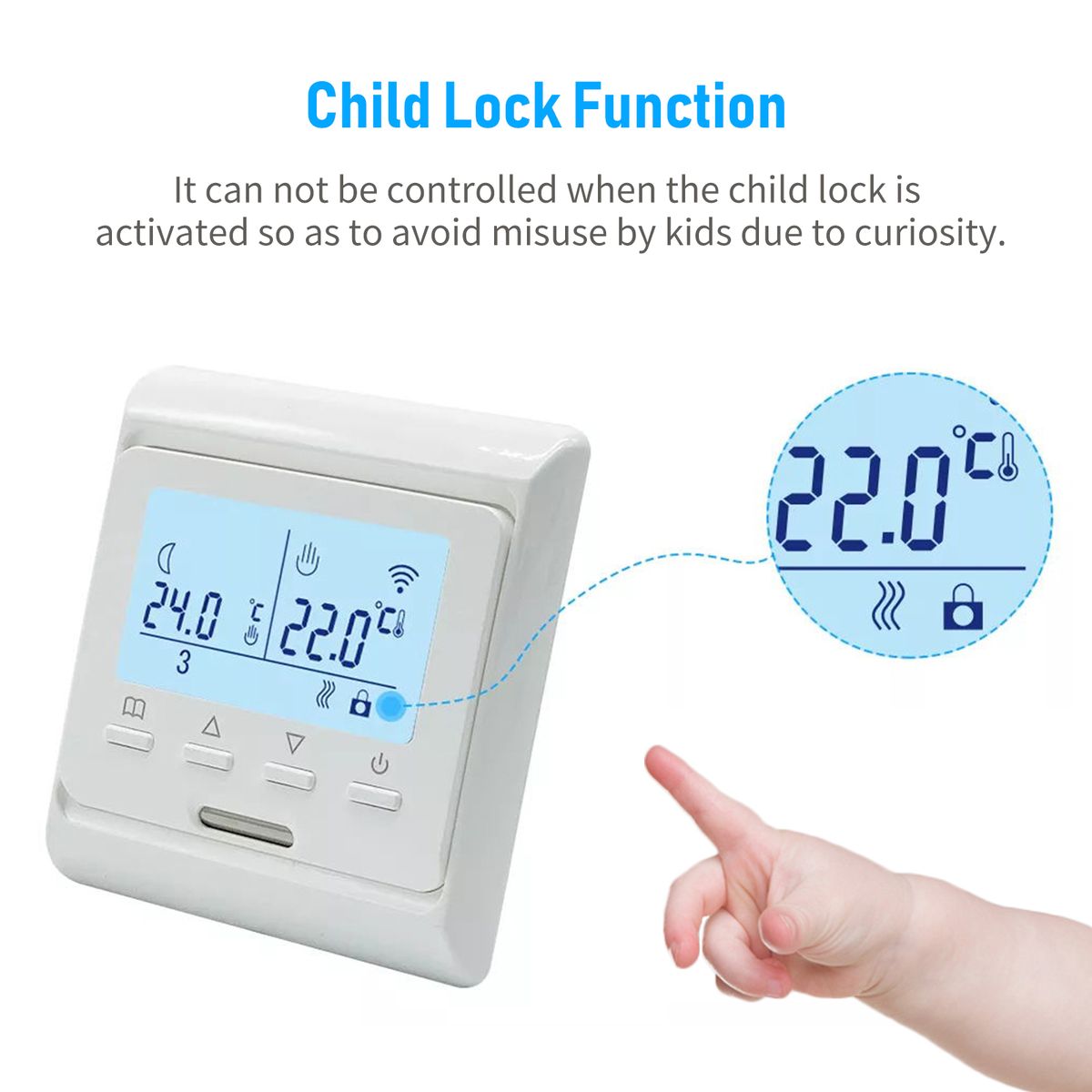 [Child Lock]The weekly-programing thermostat can not be controlled when the child lock is activated so as to avoid misuse by kids due to curiosity.