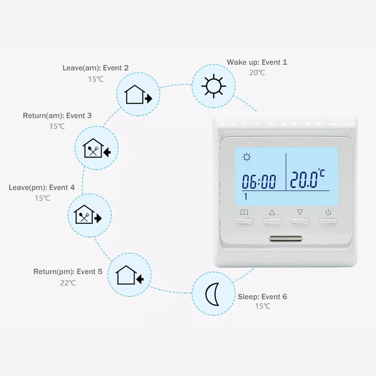 [Weekly-programmable]Smart thermostat support up to 6 events that can be set separately for each day.