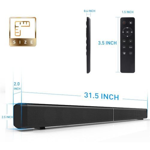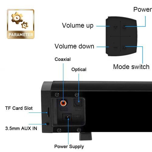 Product description1. Speaker Drivers: Four 2”Full-Range Drivers2. Bluetooth Version: V4.03. Wireless Distance: 10m4. Amplifier Chip: CLASS-D5. SNR: 76dB6. Output Power: 10W x 47. Power Supply: AC 100-240V/50-60Hz8. Operating Voltage: DC 15V/2A9. Operation Mode: Push-button10. Remote Control: Yes11. TF Card: Support12. FM: No13. Shell Material: PVC14. Color: Black15. Item Dimensions( L * H * D): about 800 × 64 × 51 mm/ 31.50 * 2.52 * 2.01 inches16. Item Weight: about 1.9 KG17. Shipping Weight: about 1.83 KG