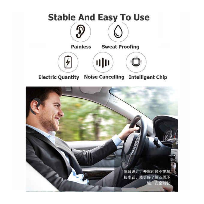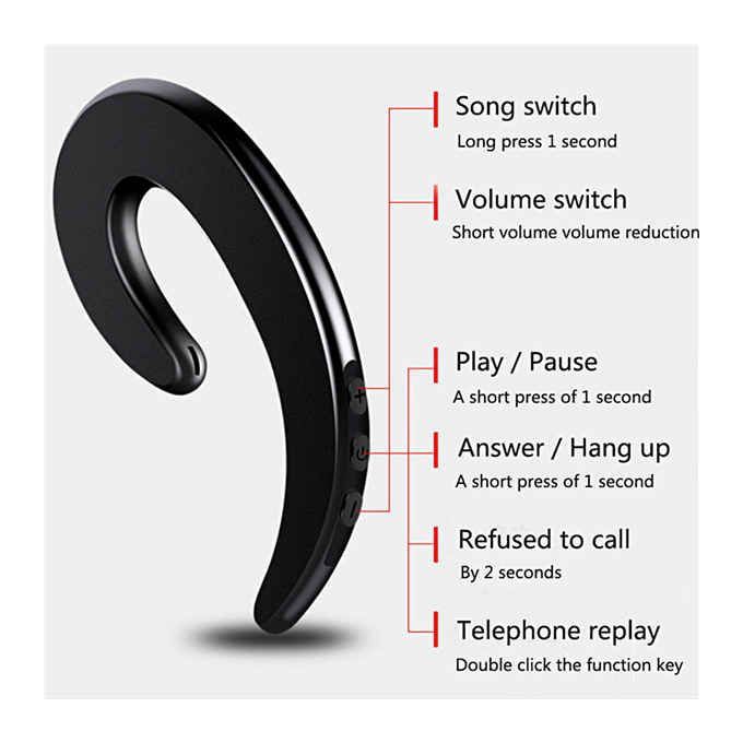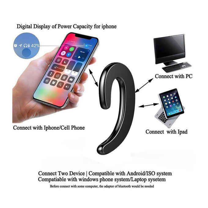 COMFORT WEARING - Be free to choose exchange your left and right ear wearing, with glasses do not affect the wear. Compatible For iOS, for Android, for WP system, as long as the devices have Bluetooth, it can be used.Bluetooth 4.2 Bone conduction headphoneSINGLE EAR HOOK TYPE HEADPHONES - Small and covert, more comfortable. is very light, painless wearing in long time use, latest concept ergonomics design fully fit outside the auricle.CLEAR CALL AND HIGH QULITY - Built-in high-performance lithium battery, 5-6 hours continuous play, 5-6hours continuous call, 1-2hours fast .SPEAKER UNIT IS EXTERNAL - Loudspeaker close to the ear but it is not inside the ear. It will help listens to the surroundings at the same time, let you keep safety for biking, running, driving and more portable for business, work.