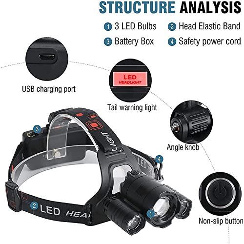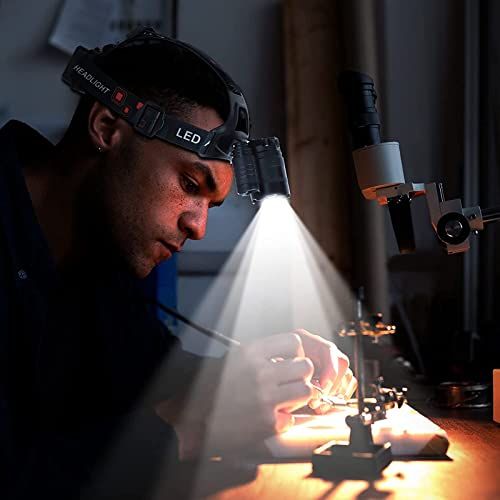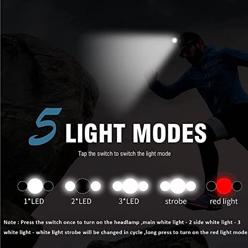 - 5 Lighting Modes White and Red Headlamp Main White Light - 2 Side White Light -3 LED White Light - 3 LED Strobe -Main Red Light (Long press to turn on red light mode ),Red & White light an meet your needs in different irstane . Animals are not spooked by a red light headlamp, great tool for fishing & hunting.