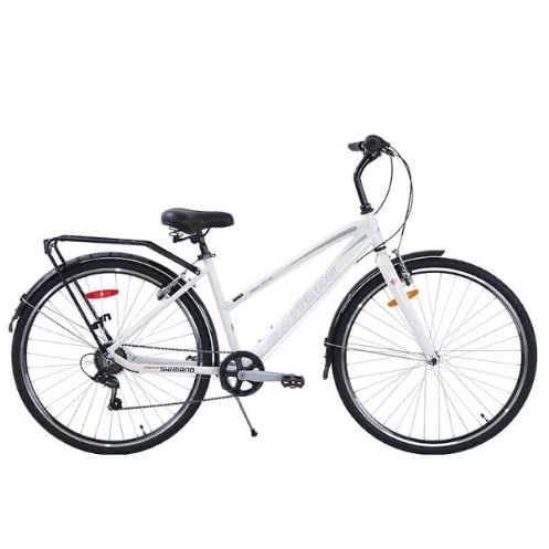This bicycle has light weight rims, the tires are smoother type tread pattern allowing for greater speed and less exertion when riding on the road. Equipped with Shimano 7 gears, shifters, and front and rear disc brakes. This bicycle is suitable for comfort - fitness, city riding or commuting.