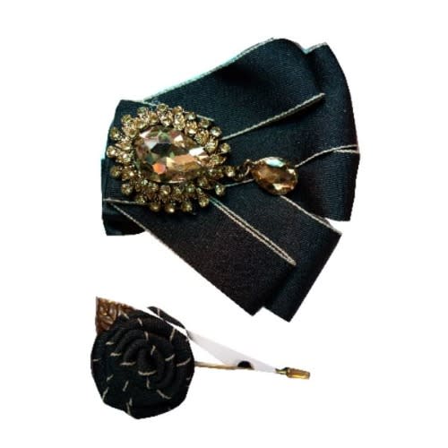 A black design bow tie and brooch, black is a universal colour that
