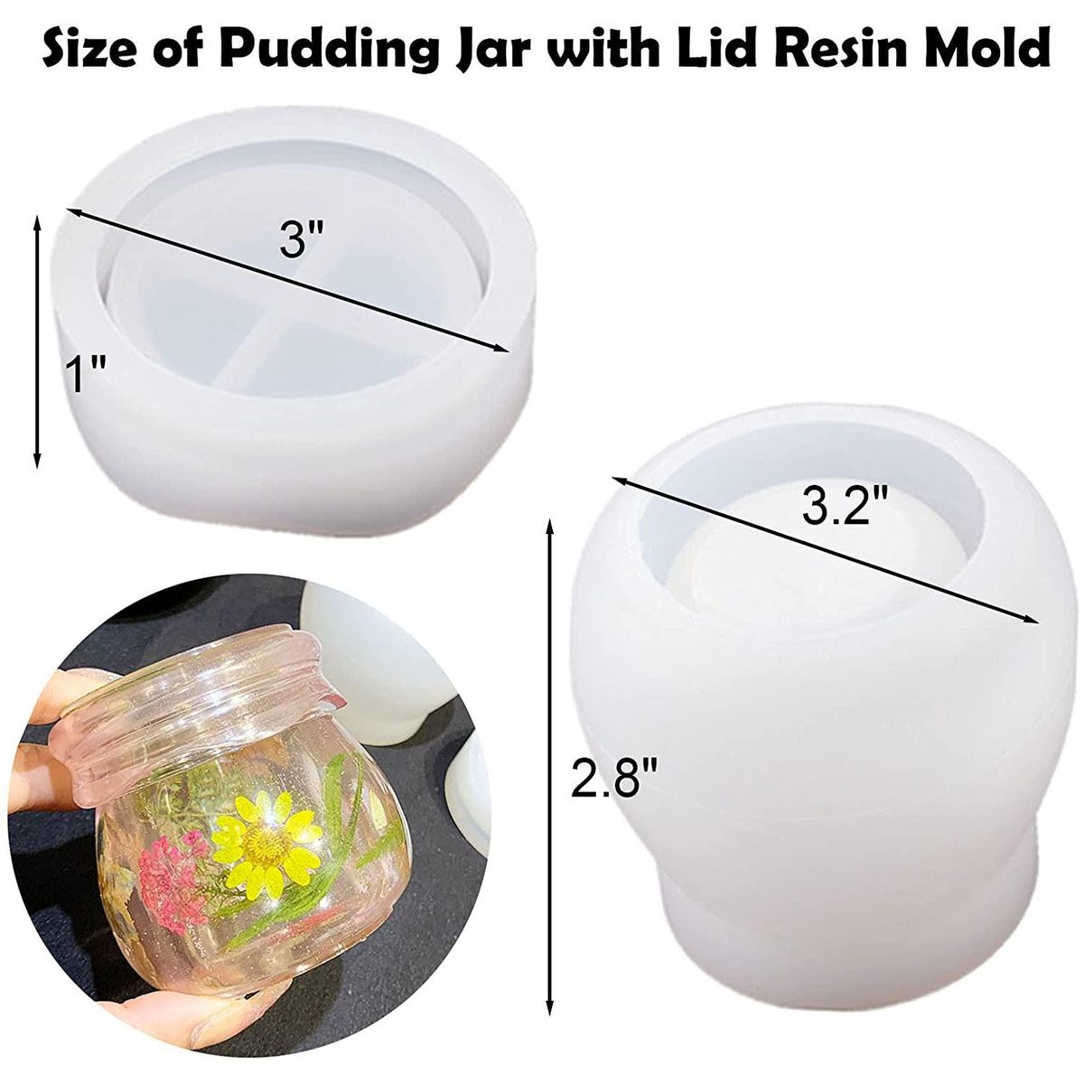 Detailed Information About The Product:Pudding Bottle with Lid Resin Molds: Cute pudding jar shape resin mold with lid. The size of bottle resin mold is 3.2x2.8 inches and the the size of lid resin mold is 3x1 inches, offer you endless DIY possibility to make your unique resin bottle.