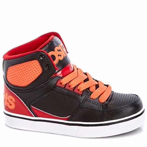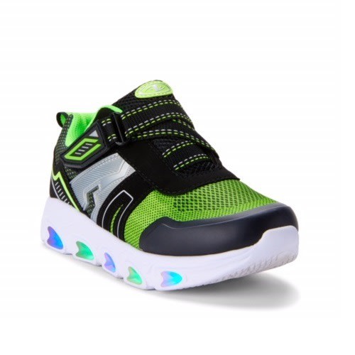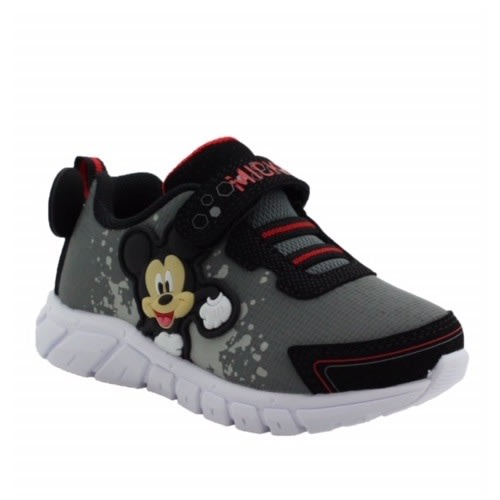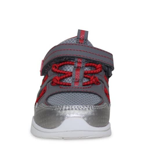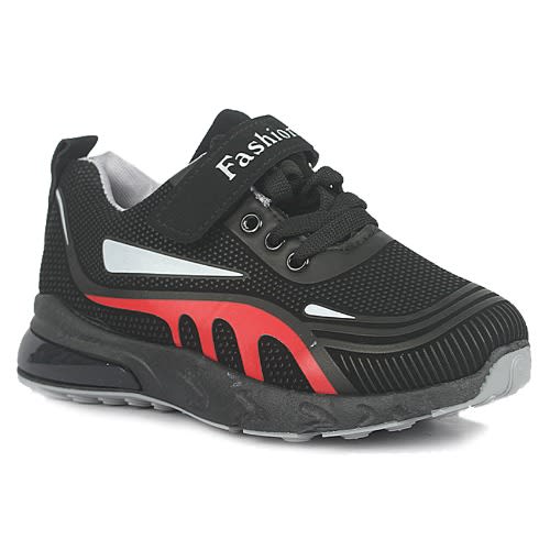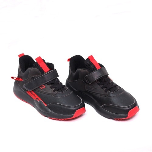 Boys black and red sneakers with rubber sole. Hook and loop closure for easy on and off and lock down fot