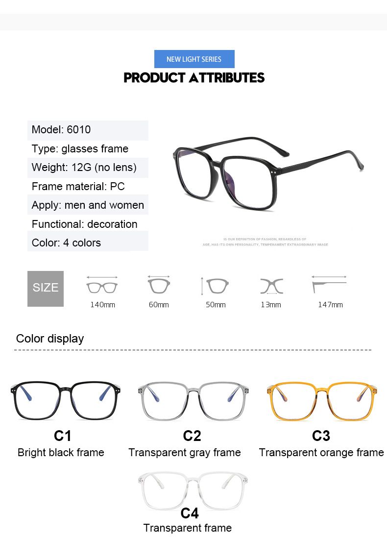 Brand: BOYSEENProduct category: glasses frameMaterial: PCStyle: full frameModel: 6010 MyopiaDegree: 50 degrees 100 degrees -600 degreesStyle: UnisexStyle: PersonalityItem: 6010 finished myopiaLens Color: Myopia -50°, Myopia -100°, Myopia -150°, Myopia -200°, Myopia -250°, Myopia -300°, Myopia -350°, Myopia -400°, Myopia -450°, Myopia- 500°, myopia -550°, myopia -600°Suitable for face: square face
