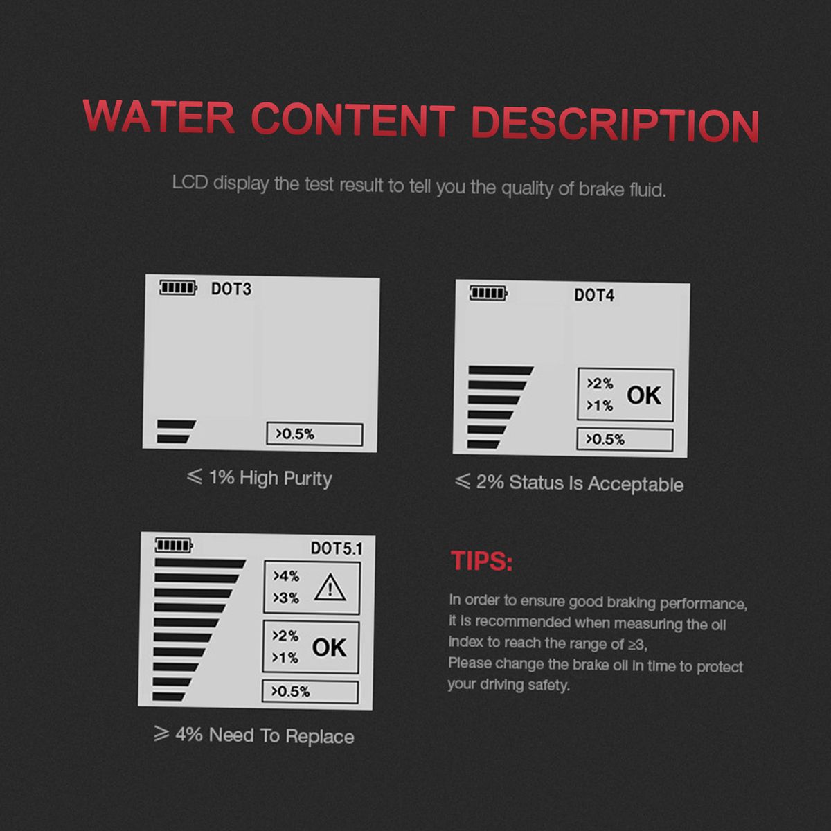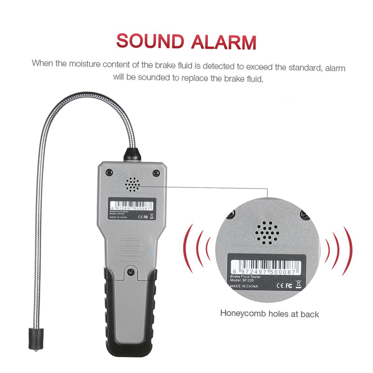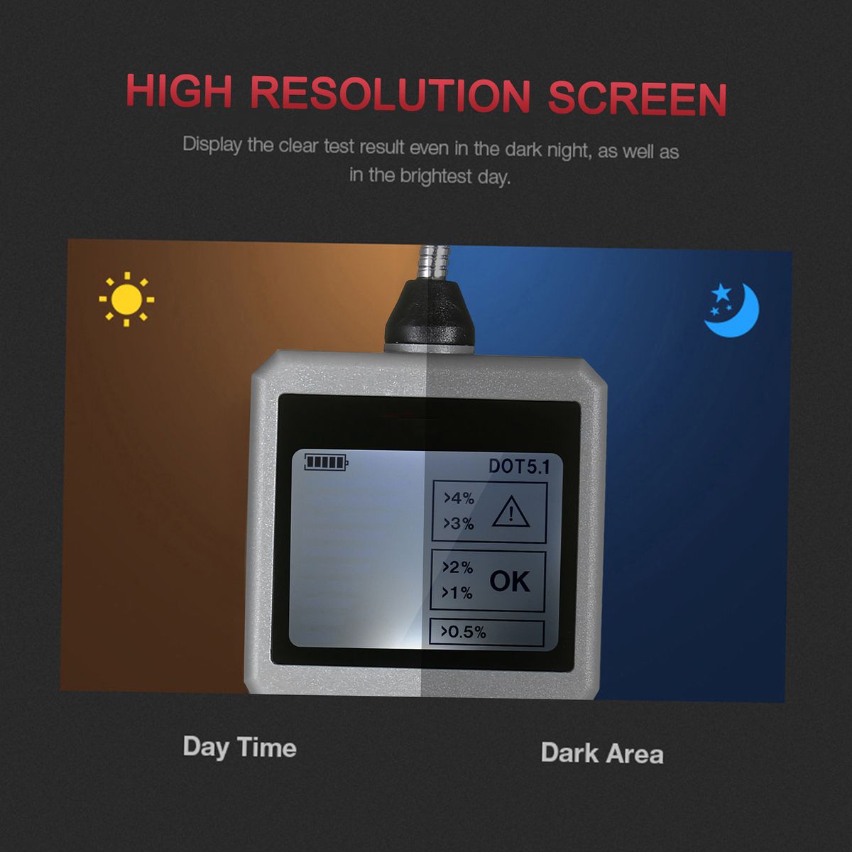 Easy Instant Reading amp; Alarm --- High Sensitivity Probe + High Resolution Screen + Sound Alarm, instand shows result, large display with backlight, easy and clear read under sun or night. Never limited by the enviroment. Once brake fluid including too much water alarm will be sound to remind you replace the brake fluid.