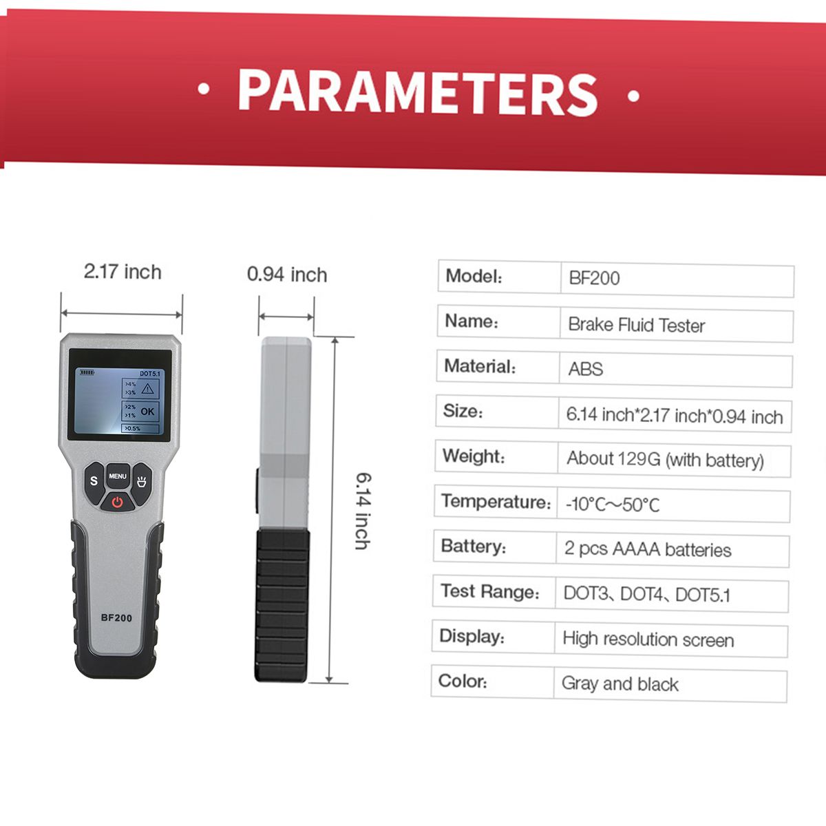 Scope of Application --- Automotive Brake Fluid Detector is common fit for most vehicle. Check the health status of DOT-3, DOT-4, DOT-5.1 brake fluid and also most synthetic brake fluids. It\'s extremly convenient for personal use and broadly applied in individual workshops, repair factories and dealer workshops.