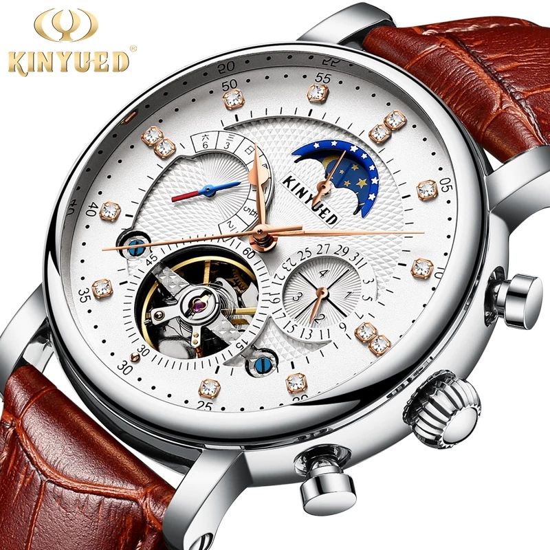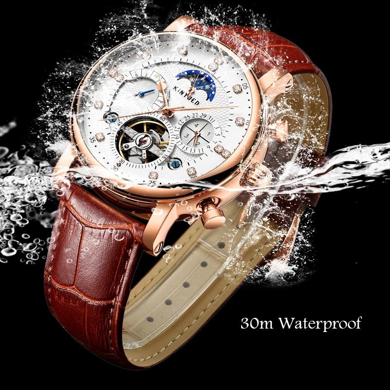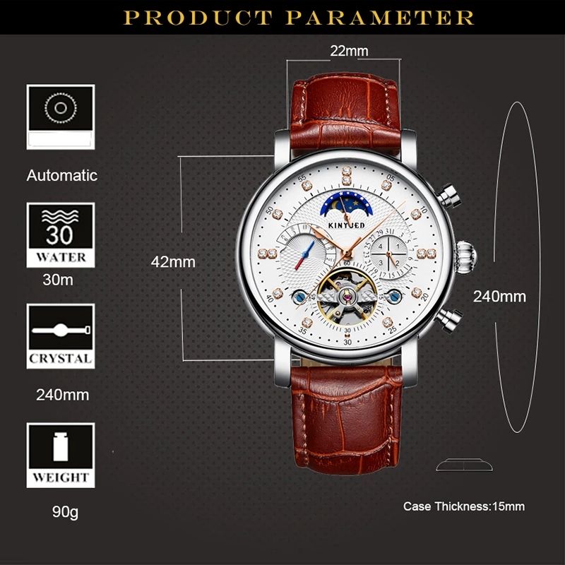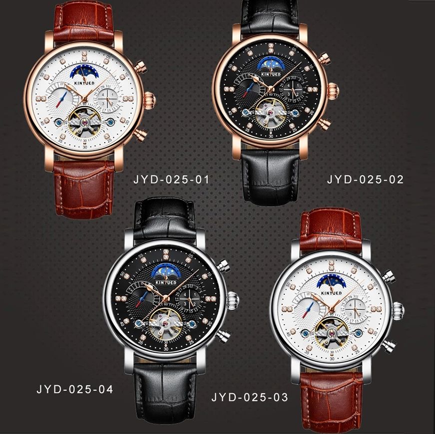 kinyued official flagship store original watch;Kinyued creative design and high quality material.Round: Made of high-quality stainless steel, hard enough and durable, genuine leather strap to ensure long service life, automatic five-hand tourbillon, mineral glass coating setting, stylish hollow design.Features: Dual calendar, time, date, week and month, easy to use,The appearance is high-end, elegant and modern, elegant and generous, especially suitable for modern and fashionable men, suitable for various occasions.Waterproof: 30m daily life waterproof, suitable for daily use, hand washing, rain, splashing sweat or short-term soaking, support cold shower and swimming. (don't pull the button in the water)Gifts: Watches are good gifts, birthdays, anniversaries, friends, relatives, father's day, graduation gifts, Valentine's Day gifts, good gifts for male friends.