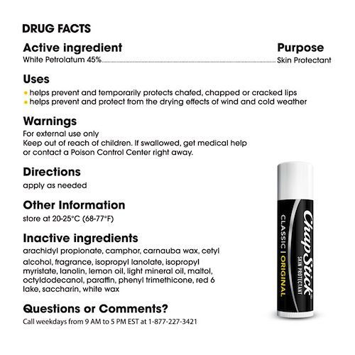 Inactive Ingredients: Arachidyl Propionate, Camphor, Carnauba Wax, Cetyl Alcohol, Fragrance, Isopropyl Lanolate, Isopropyl Myristate, Lanolin, Light Mineral Oil, Octyldodecanol, Oleyl Alcohol, Paraffin, Phenyl Trimethicone, Red 6 Lake, Titanium Dioxide, White Wax, Yellow 5 Lake.