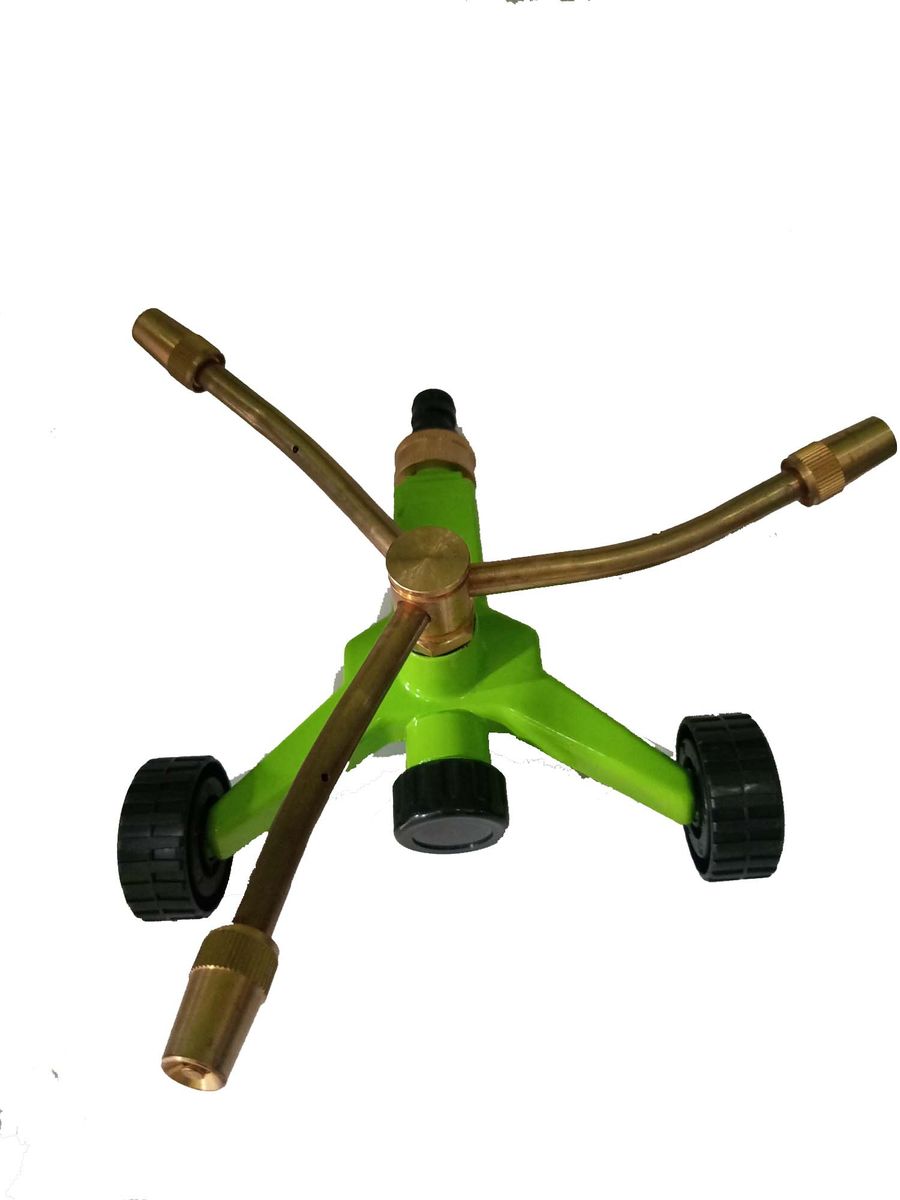 Brass 3-arms Impact Rotating Sprinkler With ConnectorThe brass 3 arm Impact rotating sprinkler is great for medium areas with coverage up to 50-feet. The wheeled base prevents tipping and is easy to move
