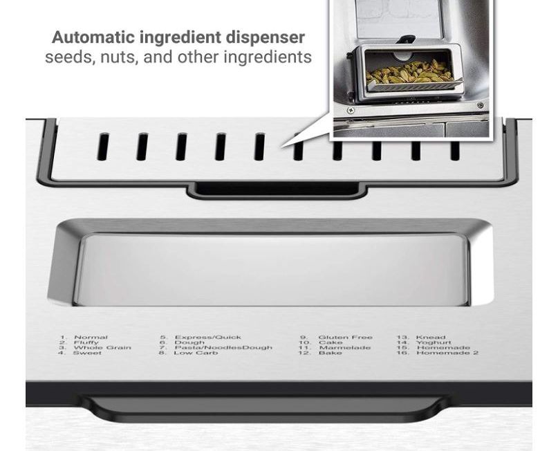 - Automatic ingredient dispenser -- seeds, nuts, and other ingredients will be automatically added to your dough to ensure your kneading paddle incorporates everything smoothly. Bake small 500G, medium 700G, and large 1000G loaves
