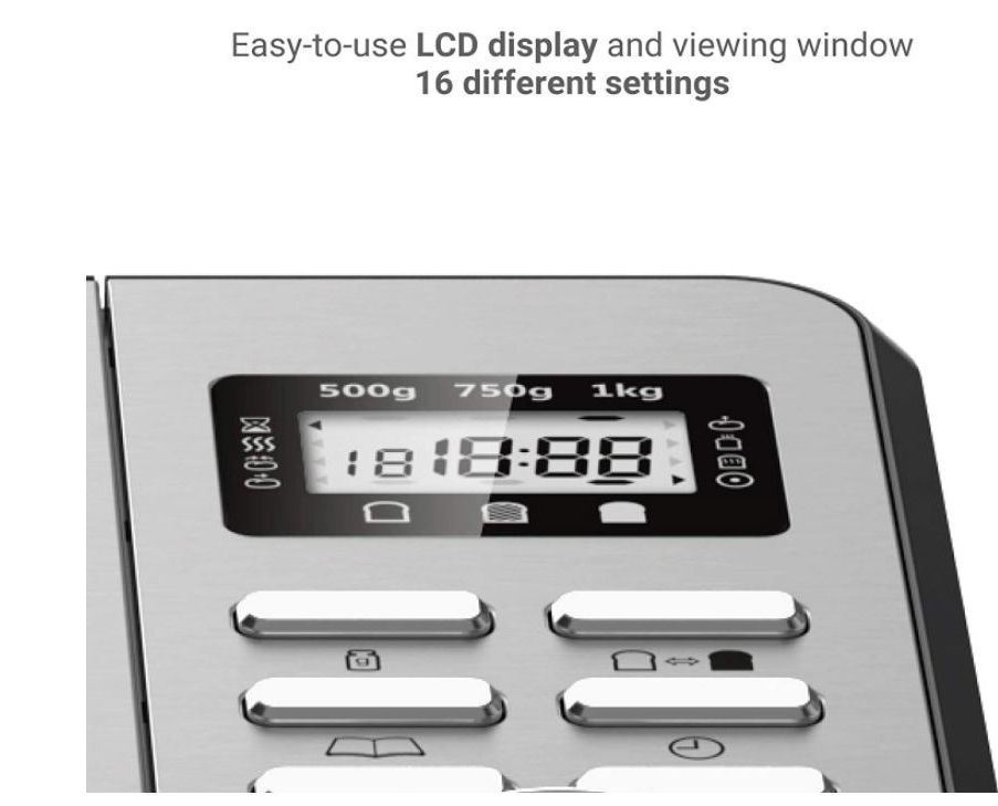 - 17 pre-set functions including gluten-free, sourdough, jam, & yoghurt -- The pre-set cycles let you easily create all sorts of different bread types and other foods that need yeast. Easy-to-use LCD display and viewing window