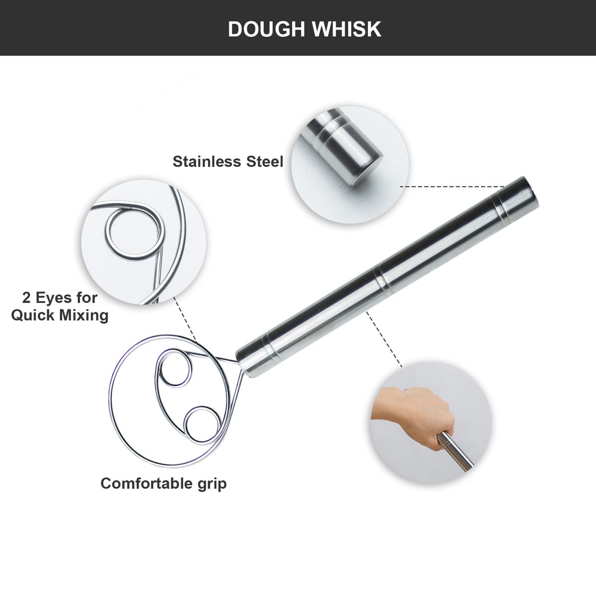 PROFESSIONAL DOUGH WHISK - Our dough whisk with 2 eyes design is 50% more efficient than the whisk with 1 eye. Easier for baking lover to make quick bread. Extra-long and ergonomically handle for your comfort.