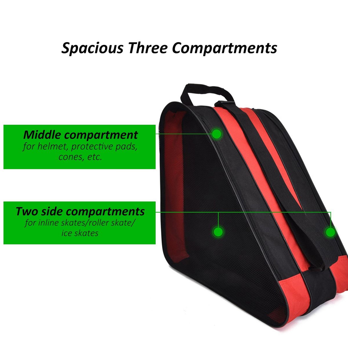 The skate carry bag includes three compartments to provide large capacity for storing your skates, and skating accessories.