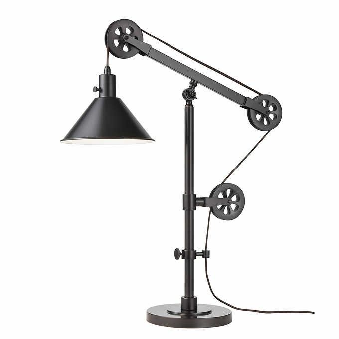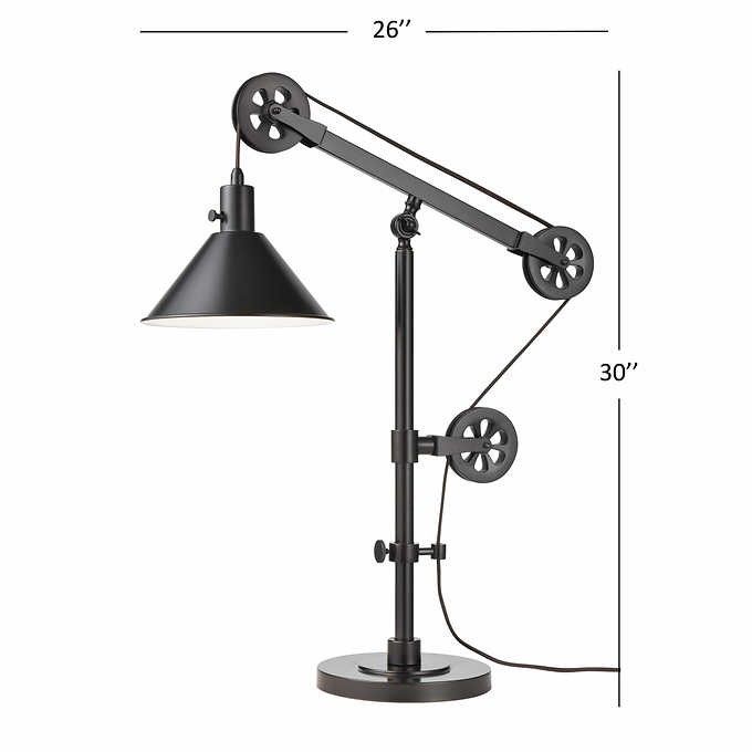 Illuminate your favorite Desk or End Table with this nostalgic light. The Industrial style adjustable pulley system is both functional in design and will make a fashion statement in any room of the house. Both simplistic yet sophisticated. Fusing function and factory flair, this table lamp is sure to spark conversation as it shines a light down on any tabletop. Crafted from steel, this statement piece features an industrial-inspired pulley system so you can adjust its height to suit your task. Though it's distinctive, this lamp sports a solid finish that's versatile enough to blend with a variety of color palettes and aesthetics. A cone-shaped shade completes the look with vintage appeal, directing light downwards.