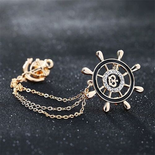 - Brooch Pin Anchor Rudder Suit Lapel Collar Accessory With Chain - Gold.