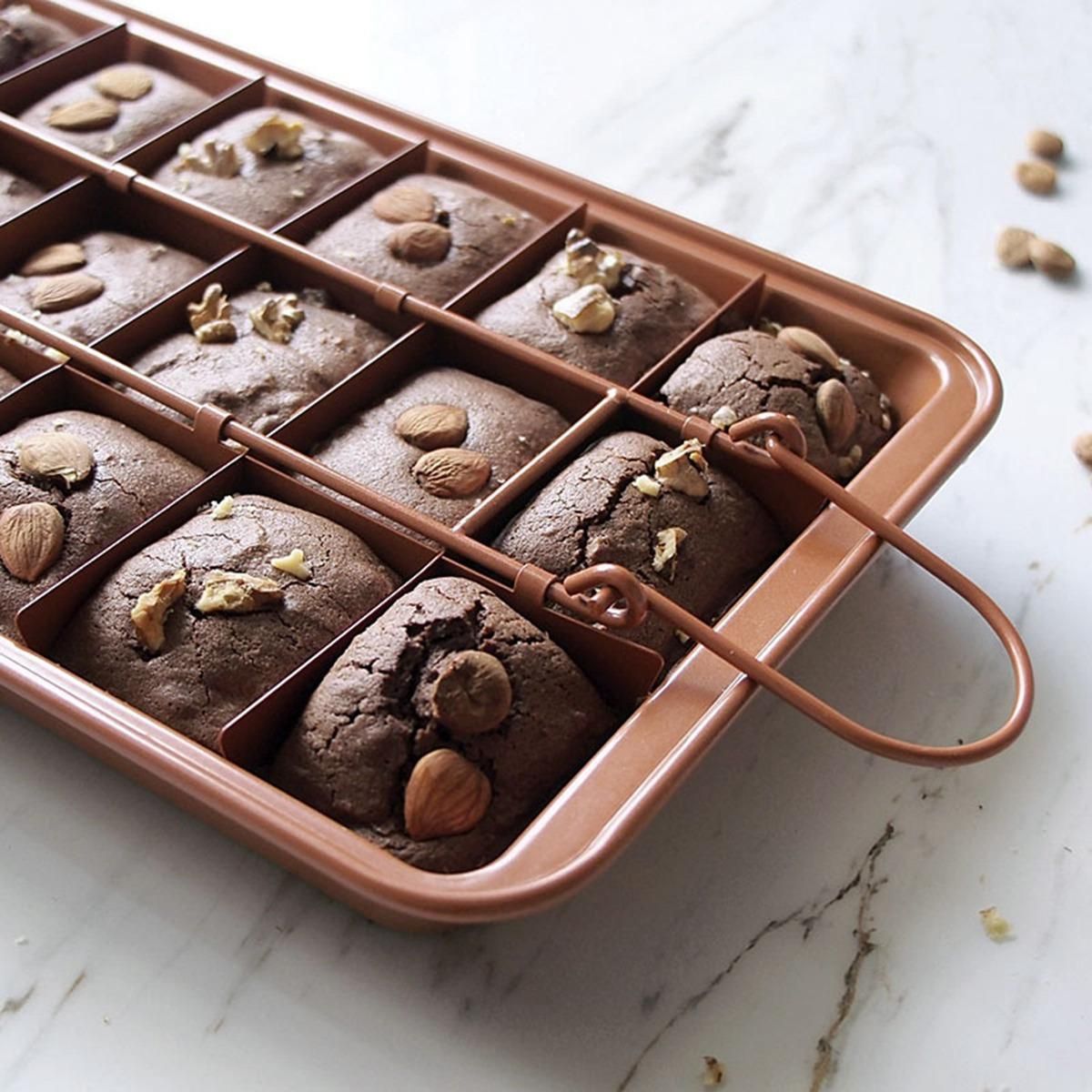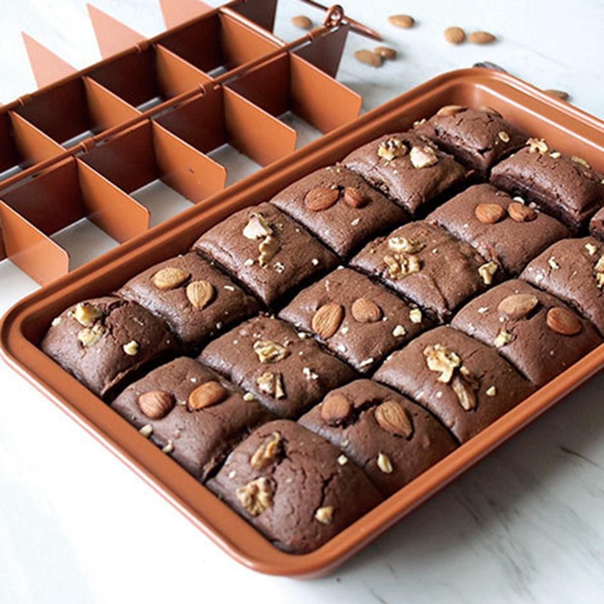 [Brownie pot with partition]: A professionally loved chef's brownie pan with a detachable partition, which can make 18 perfectly sliced brownie cakes. The bakeware can be used to make your favorite cakes, such as brownies, mini cakes, cheesecakes, mousse cakes, desserts, square pizzas, etc.