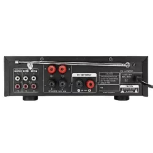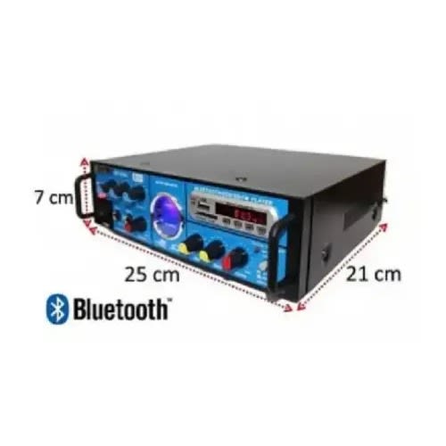 Description:Amplifier with excellent features and equipped with several complete functions!It gives you the ability to connect with 2 microphones for karaoke, FM radio, play MP3 files and connect via Bluetooth to devices such as mobile phones, smartphones, and tablets.It has a USB port and SD card slot from which you can listen to your favorite music!Do karaoke and sing two people at the same time!On the front, there are controls for playing tracks, a screen, and buttons for volume controls.You can also manage everything using the remote control provided, such as volume, treble, and bass.