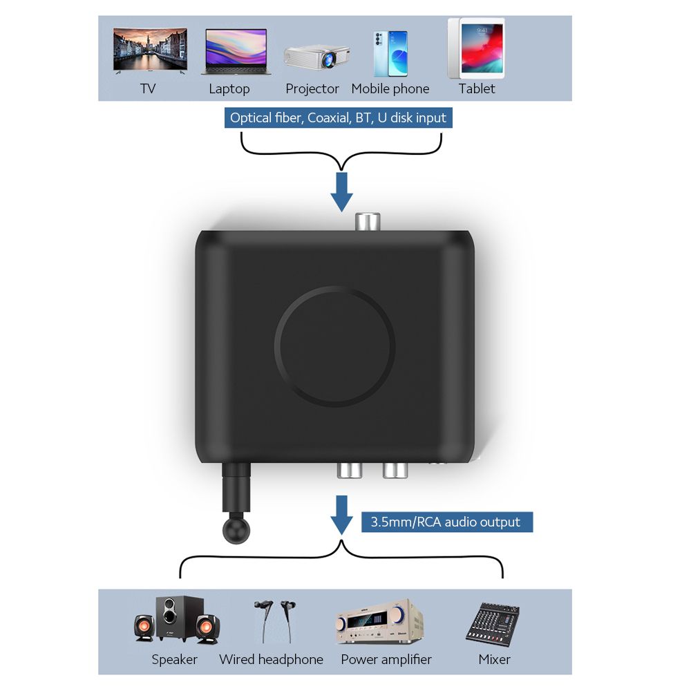 It converts optical fiver/coaxial digital signal to 3.5mm/RCA signal, can connect speaker, wired headphone, power amplifier and other output devices.