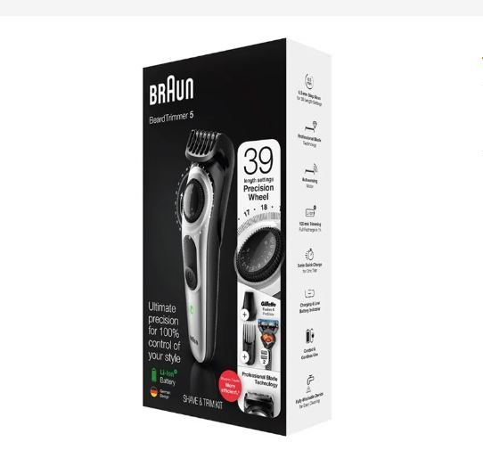2 trimming combs and precision dial offer 39 length settings from 0.5 - 20 mm for any beard or hair style. Combined with lifetime sharp blades, the Braun BeardTrimmer guarantees ultimate precision for an even cut and accurate lines and edges. Plus free Gillette Fusion5 ProGlide razor for a clean shave.