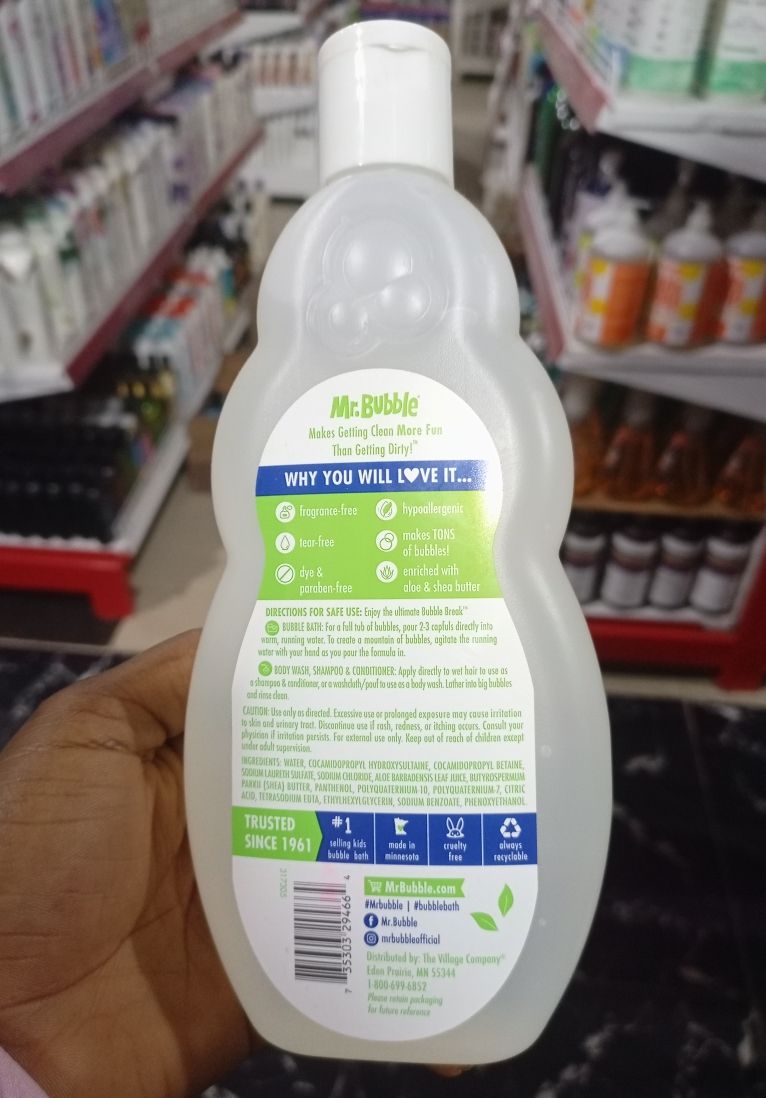 Mr Bubble makes getting clean more fun than getting dirtyDirections for use: enjoy the ultimate bubble break Bubble bath: For a full tub of bubble, poure 2-3 capfuls directly into warm, running water. To create mountain of bubbles, agitate the running water with your hand as you pour the formula in.Body wash, shampoo & conditioner: Apply directly to wet hair to use as shampoo & conditioner, or as a washcloth/pouf to use as a body wash. Lather into big bubbles and rinse clean.